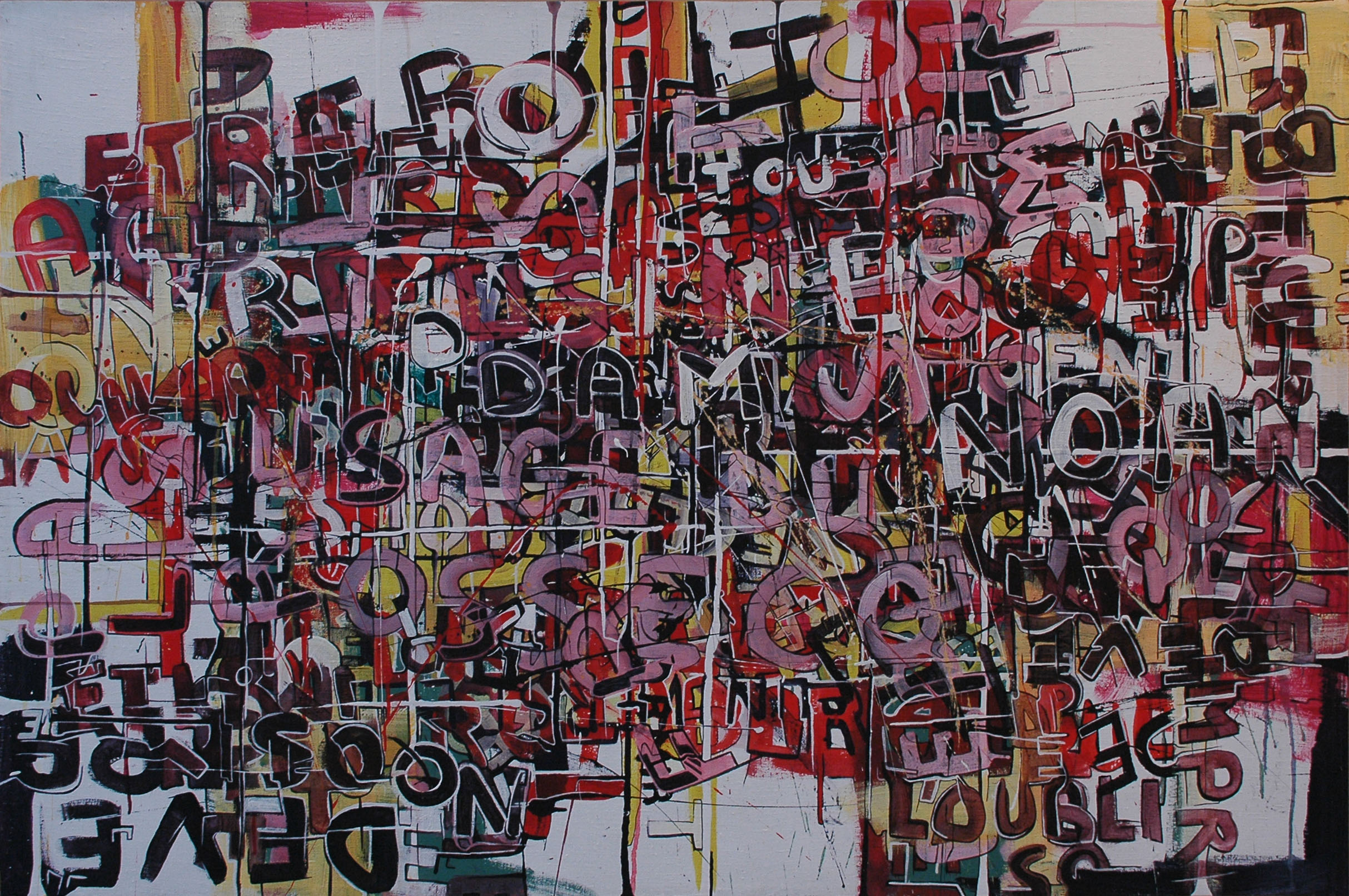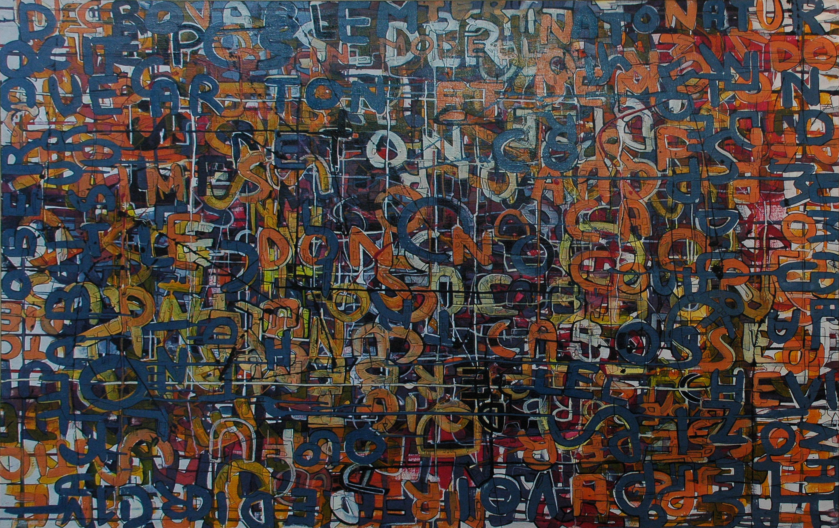 Jean-Charles Brune peint de superbes tableaux grands et colorés, dont beaucoup ont à voir avec les mots et la parole, d’où toutes les lettres dans ses travaux.